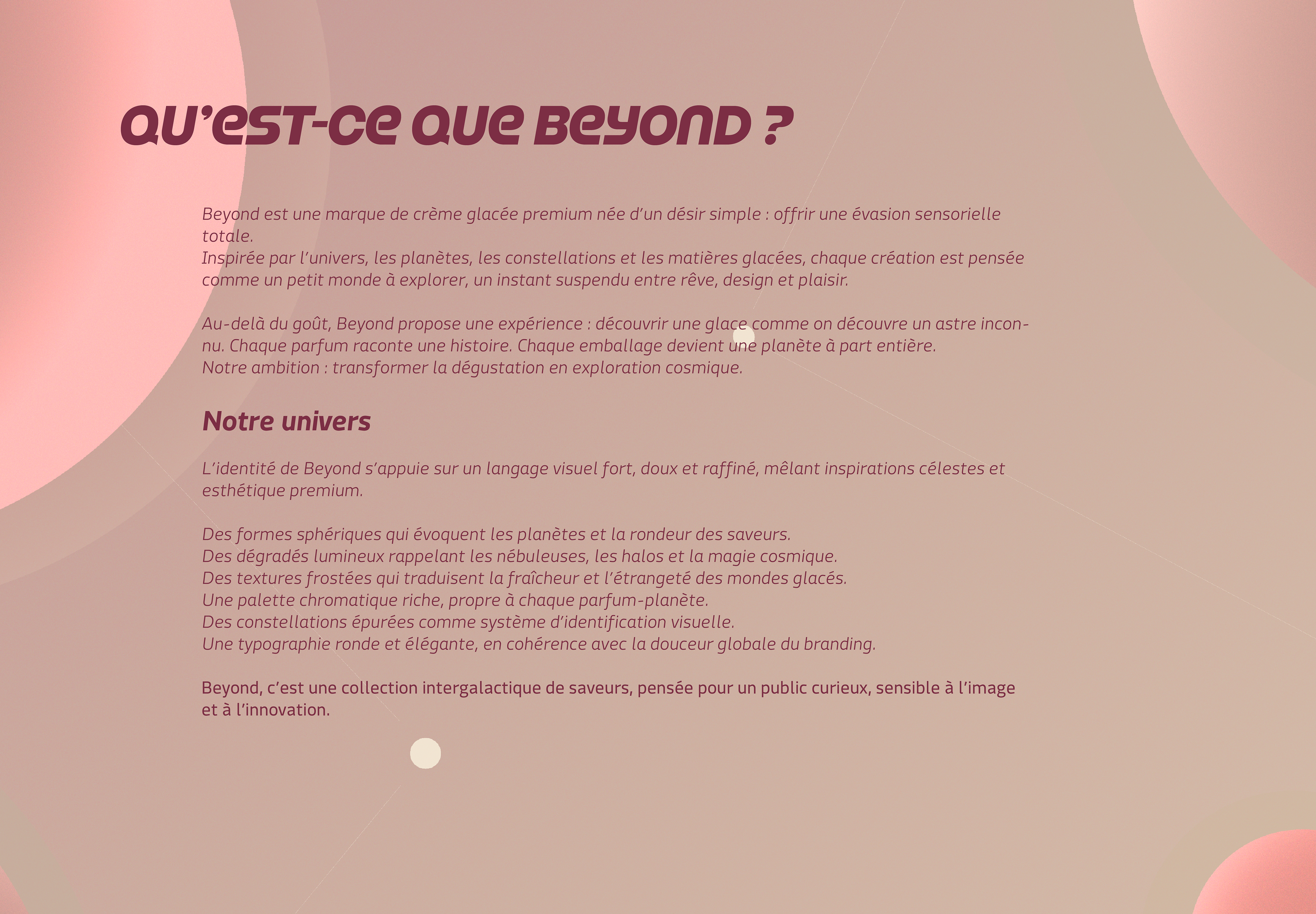 Identité visuelle complète (logo, packaging, palette, typographie) conçue pour Beyond, une marque fictive de crèmes glacées artisanales. L’univers visuel incarne plaisir et fraîcheur, tout en évoquant une touche artisanale et moderne.