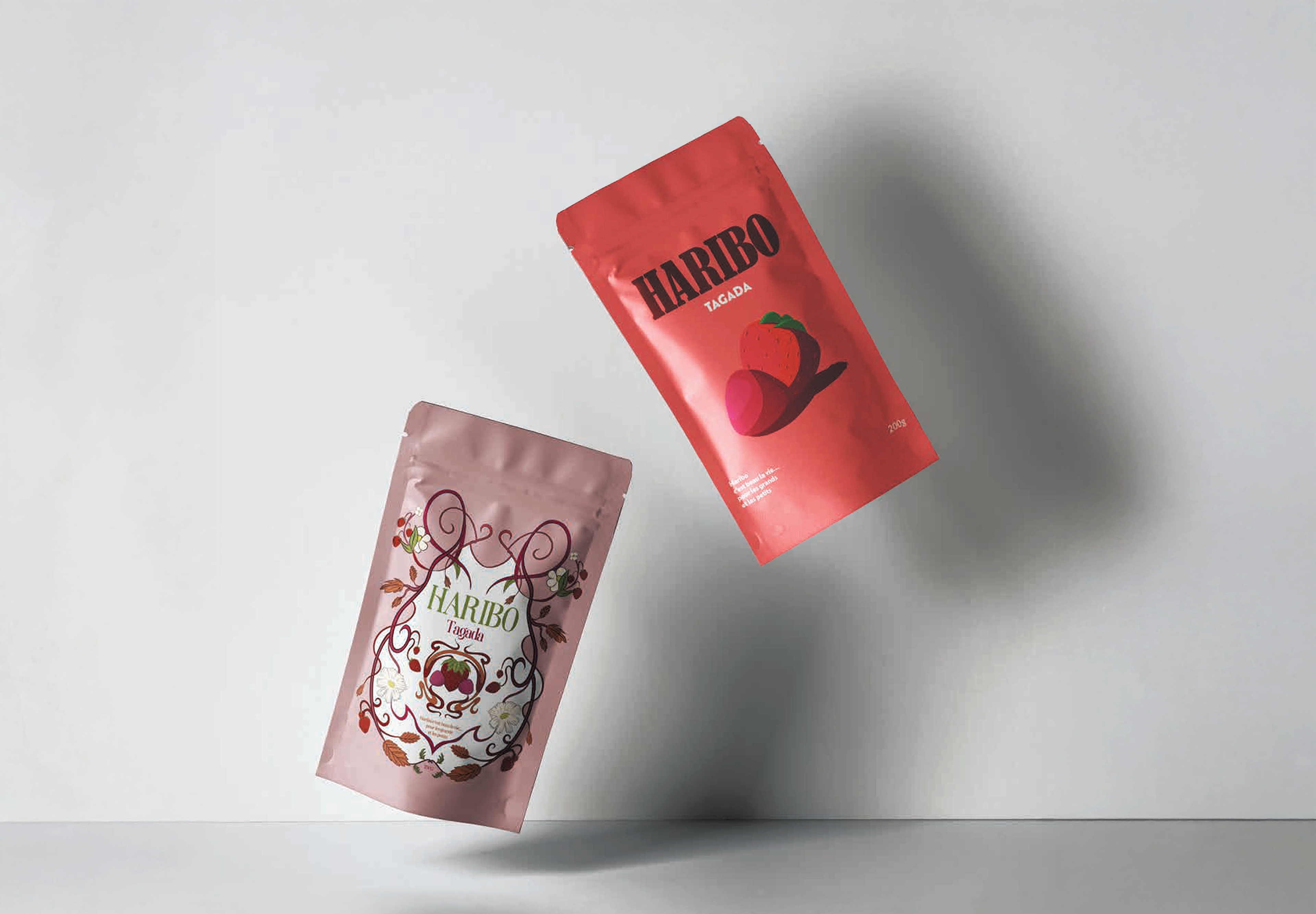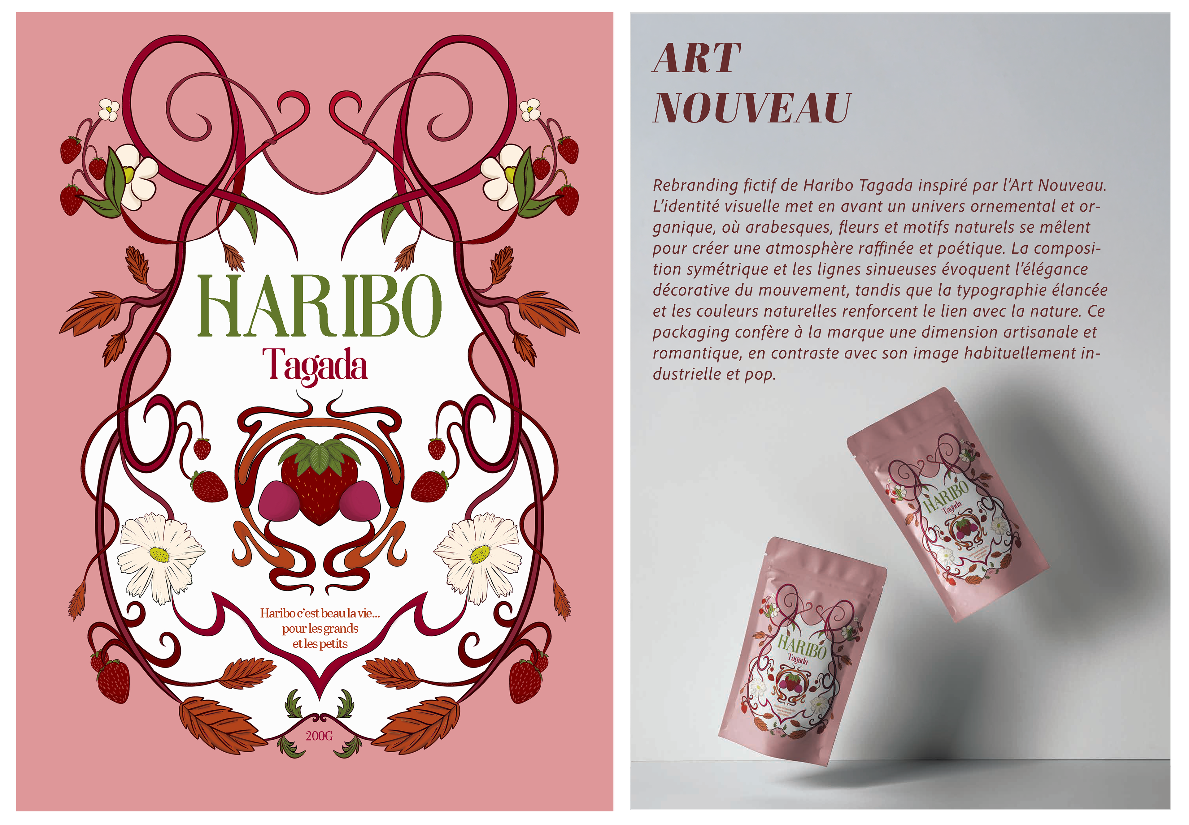 Projet fictif de rebranding de Haribo Tagada explorant deux mouvements graphiques contrastés. La version Art Nouveau met en avant un univers ornemental et organique, avec arabesques et motifs floraux qui confèrent au packaging une dimension artisanale et poétique. La version Objectivité nouvelle adopte une approche rationnelle et fonctionnelle, privilégiant la lisibilité, la simplicité et les aplats de couleur. Ensemble, ces deux interprétations illustrent la capacité d’une même marque à être déclinée selon des esthétiques radicalement différentes.